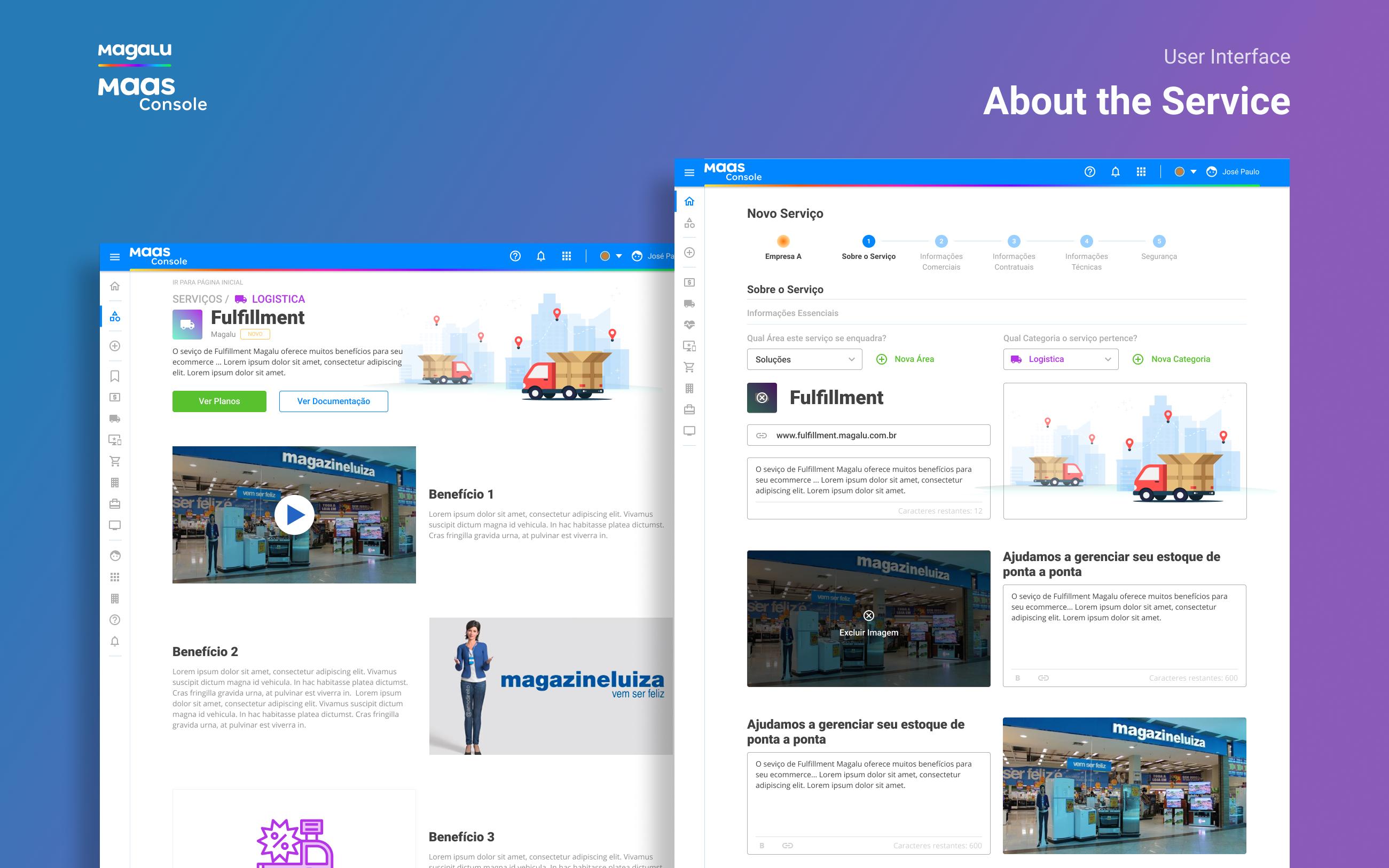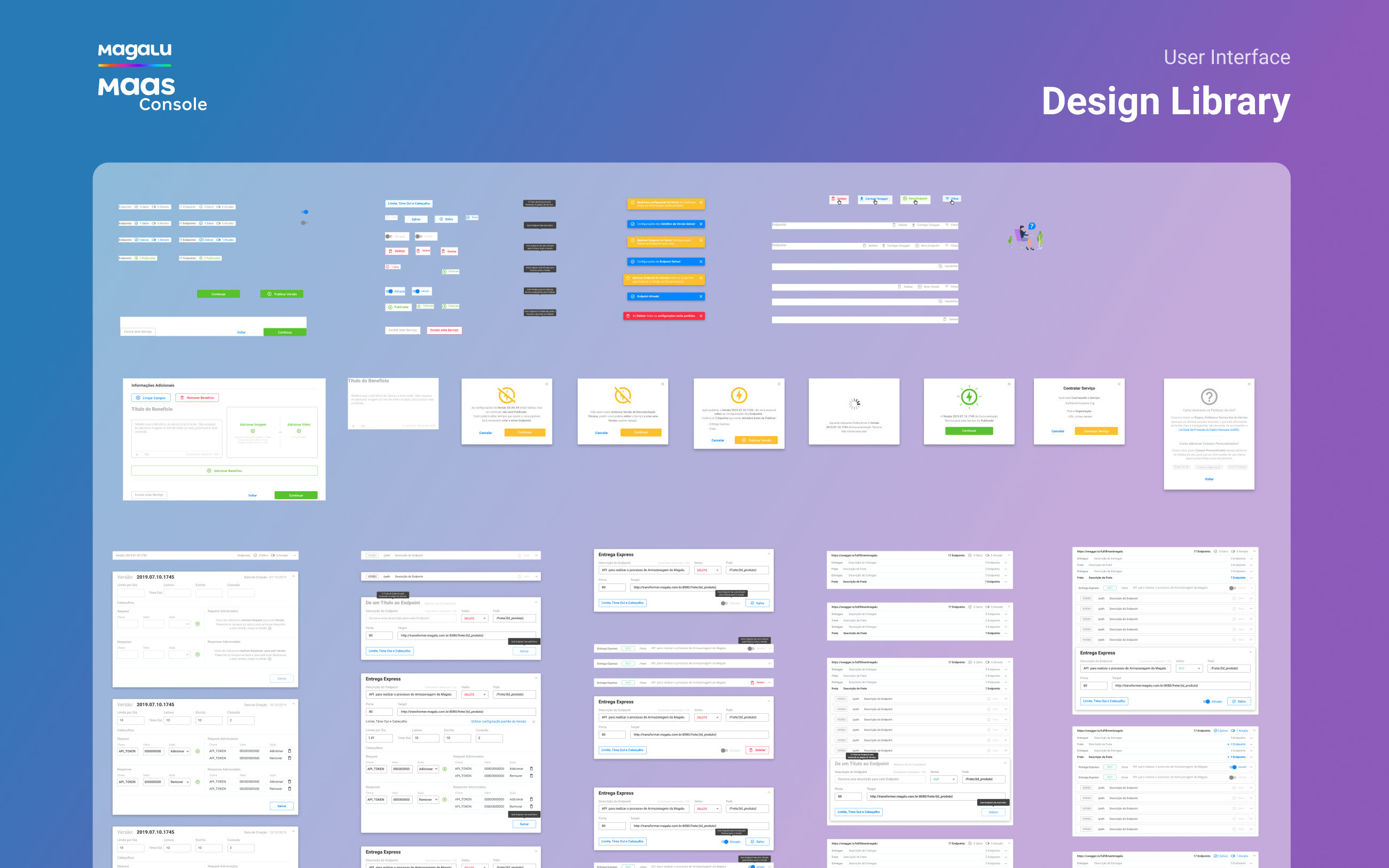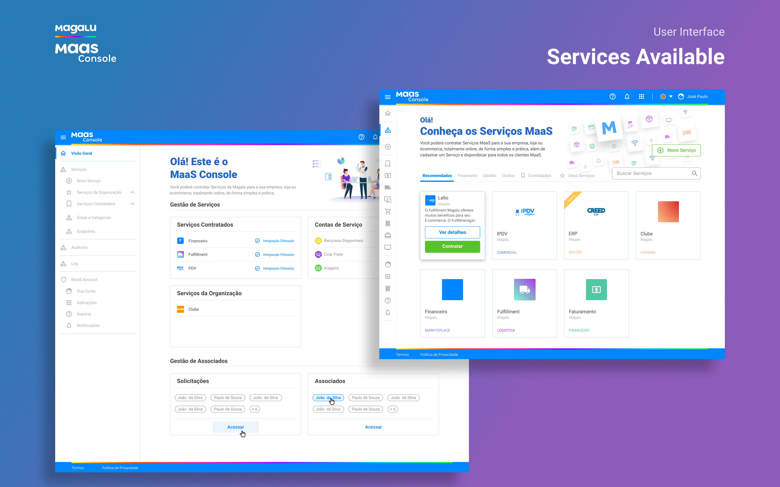 I worked at Magazine Luiza (One of the biggest retailer companies in Brazil) as UX/UI Designer, and my challenge there was to Design from scratch the ecosystem of the MaaS Platform (Magalu as a Service). The MaaS platform is formed by two applications: the MaaS Console and the Maas Account. The MaaS Console is a marketplace for retail services that will allow Magazine Luiza and other retail stores to sell digital or physical services online (free services too) to small retailers integrated on their own e-commerce, paying based on the demand used, like Firebase do it for back-end cloud services.