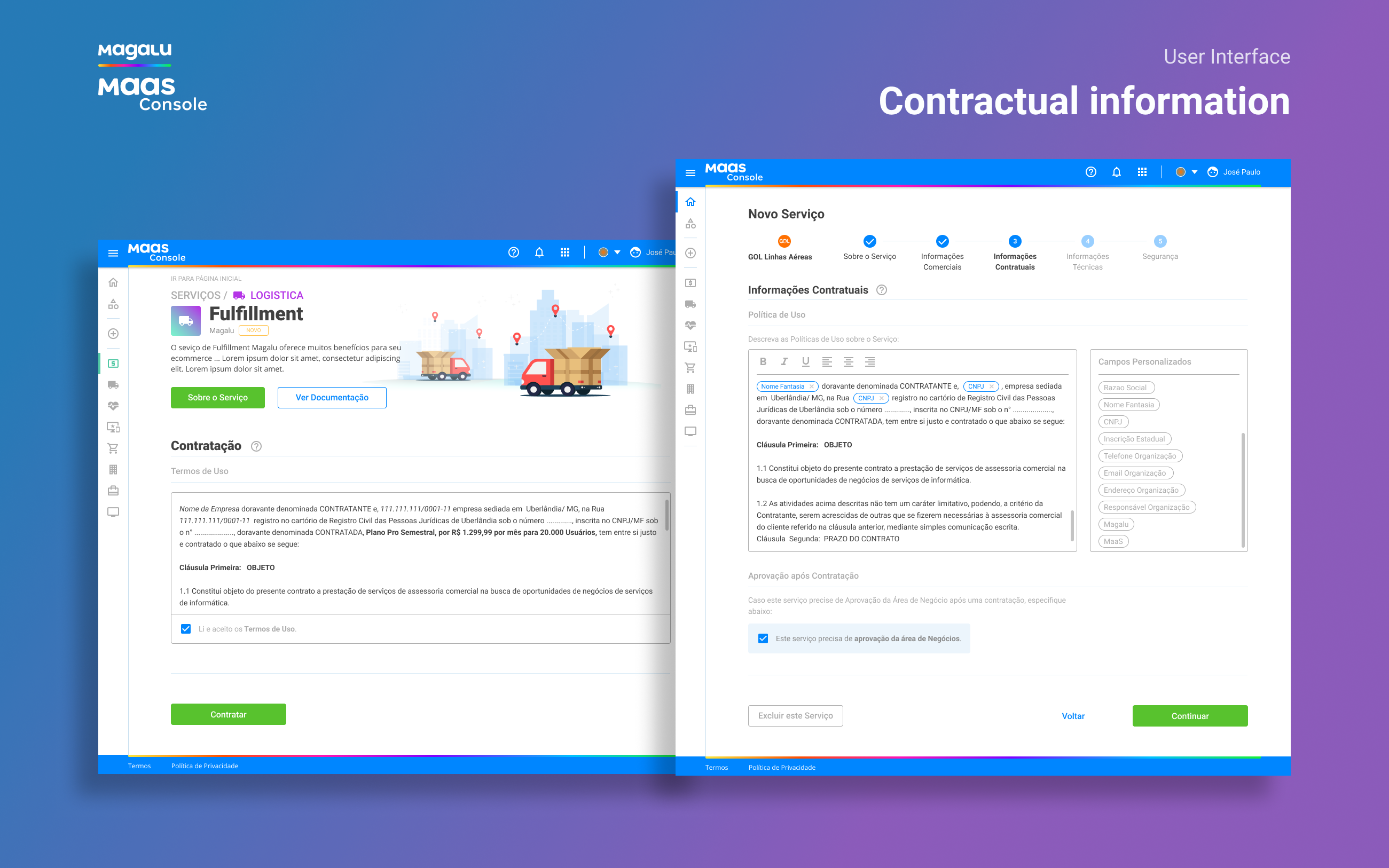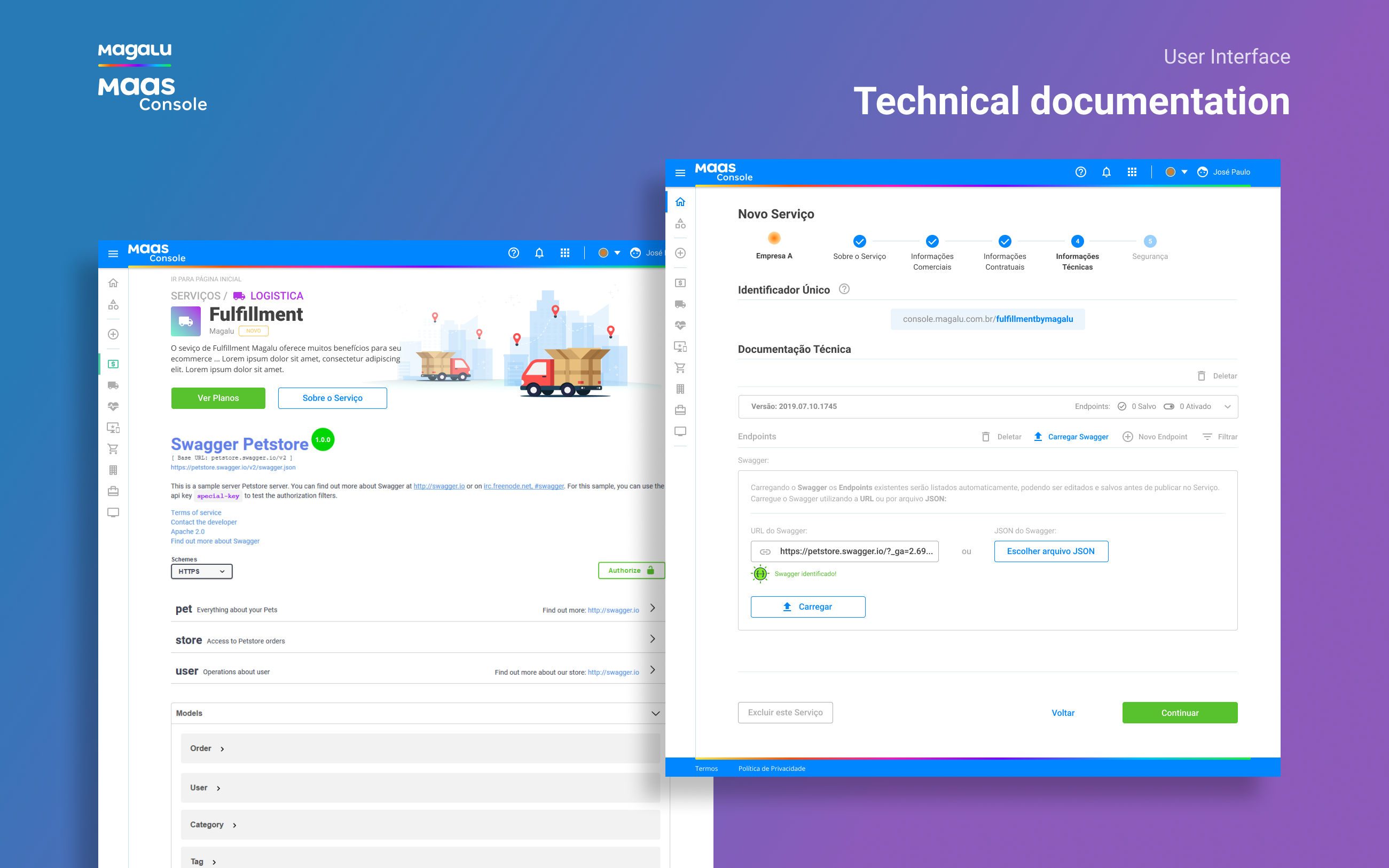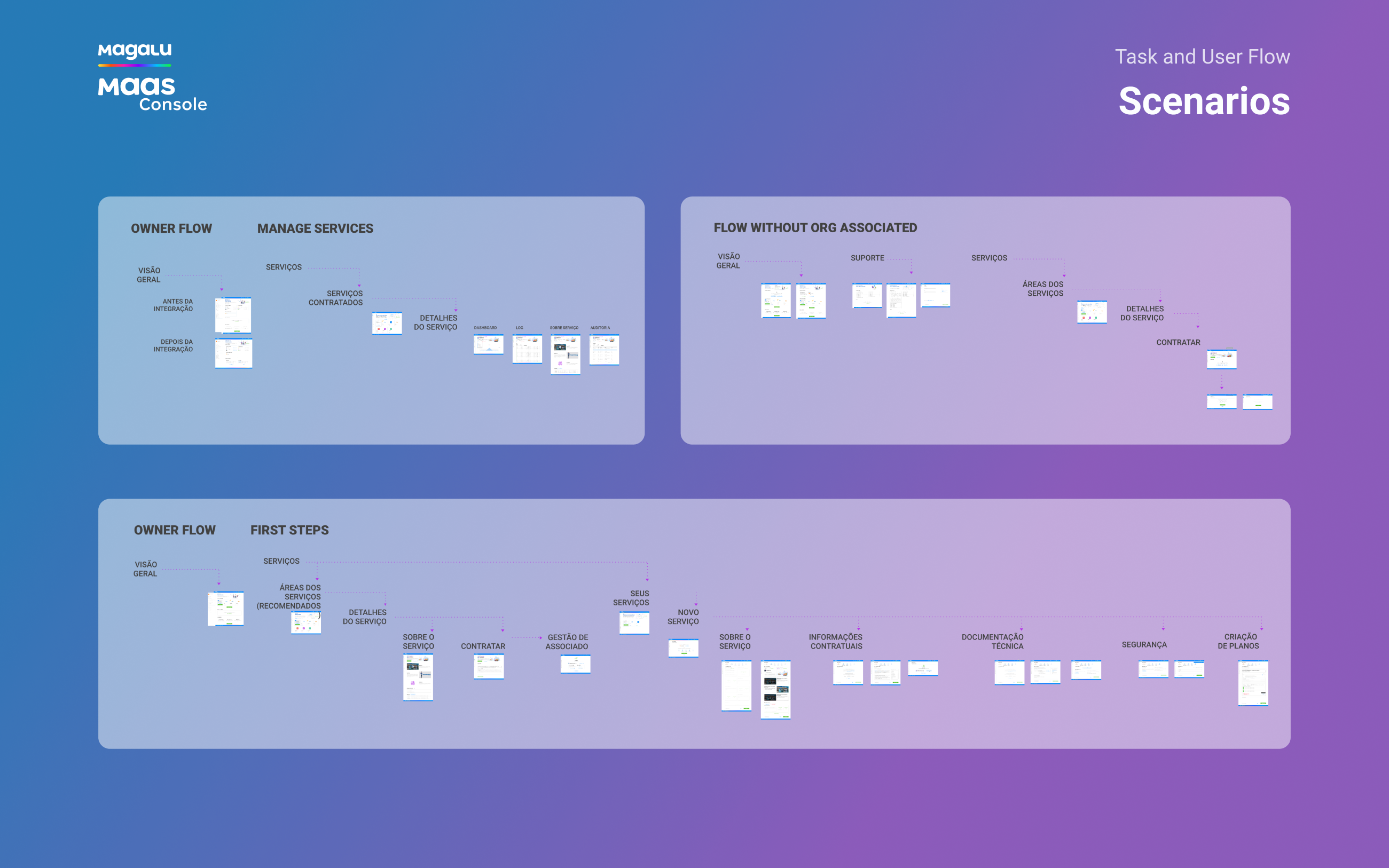 I worked at Magazine Luiza (One of the biggest retailer companies in Brazil) as UX/UI Designer, and my challenge there was to Design from scratch the ecosystem of the MaaS Platform (Magalu as a Service). The MaaS platform is formed by two applications: the MaaS Console and the Maas Account. The MaaS Console is a marketplace for retail services that will allow Magazine Luiza and other retail stores to sell digital or physical services online (free services too) to small retailers integrated on their own e-commerce, paying based on the demand used, like Firebase do it for back-end cloud services.